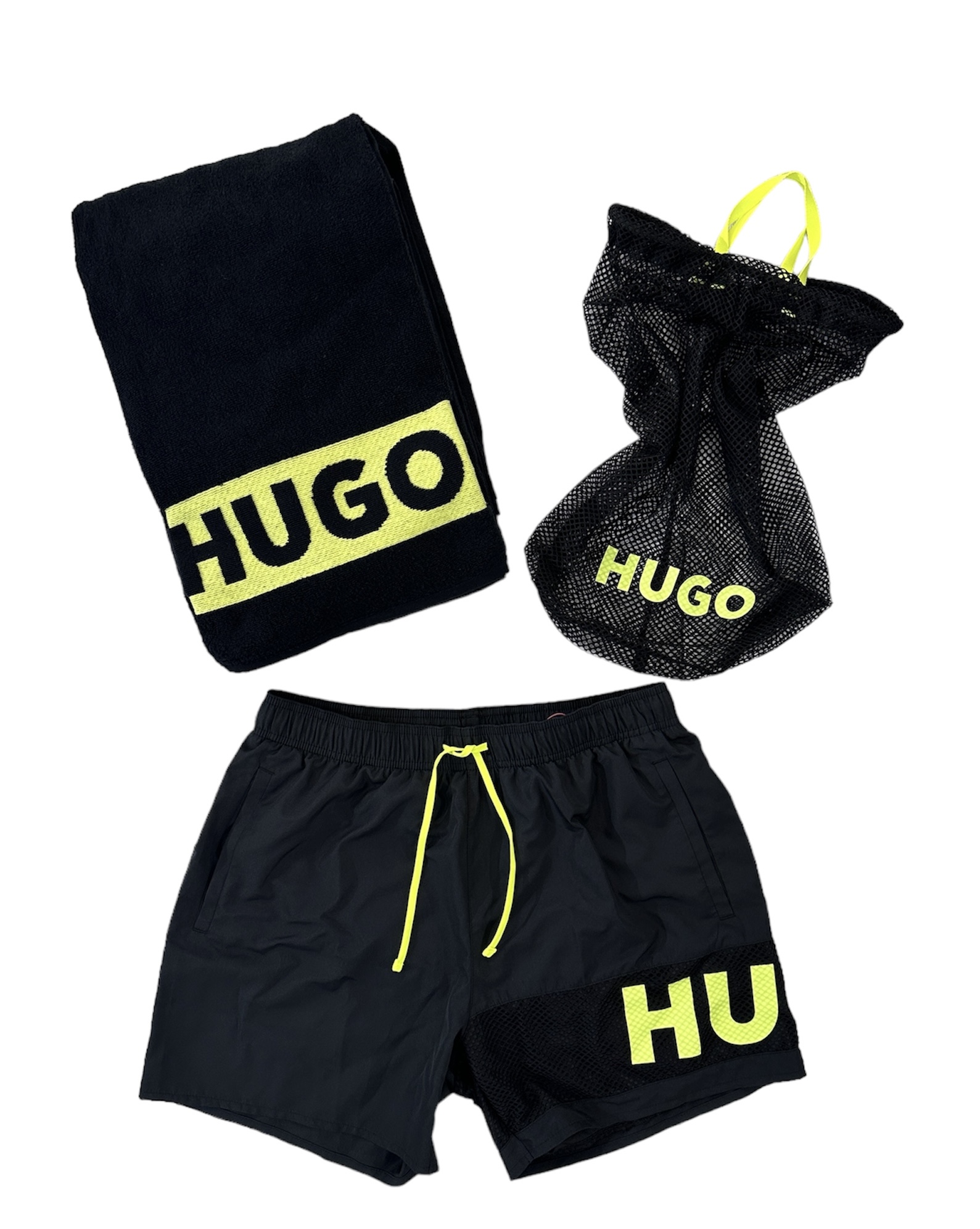 HUGO Strand-Set, das aus einem Baumwoll-Handtuch mit Branding, einer passenden Badeshorts aus einem schnell trocknenden Gewebe mit durchgehendem Innenfutter und einem Mesh-Beutel mit Kordelzug besteht.