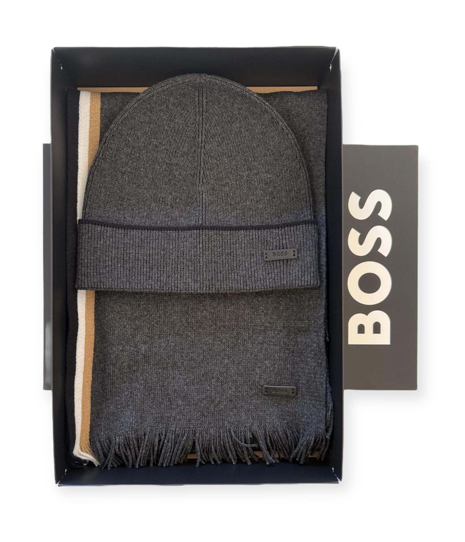 Das BOSS Accessoire-Set in einer Box ist das perfekte Geschenk für die Wintermonate. Aus einem Material-Mix mit Baumwoll-Anteil. Umfasst eine Mütze und den passenden Schal aus Raschel-Strick. Die Maße: 170,0 x 24,0 Zentimeter.