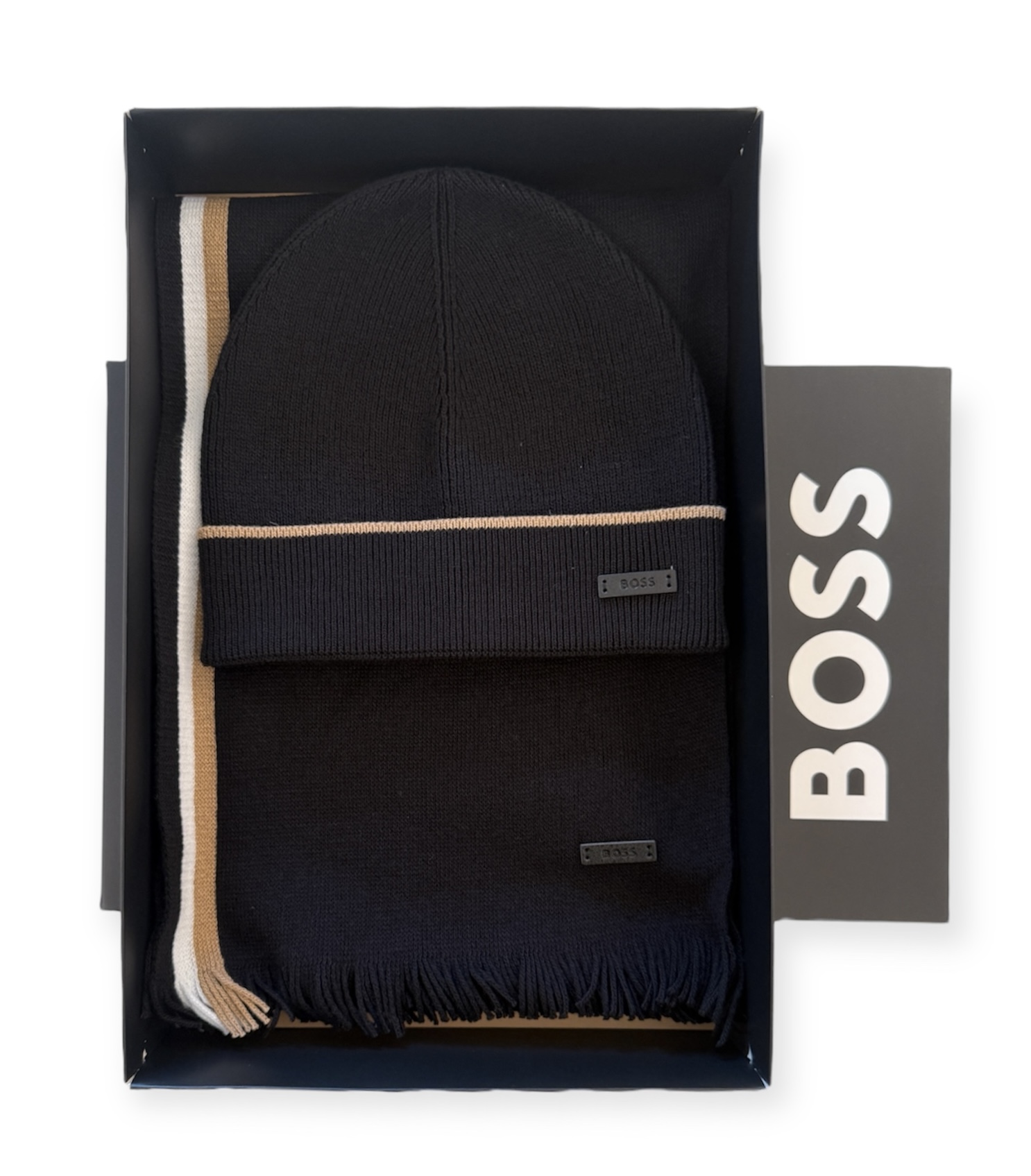 Das BOSS Accessoire-Set in einer Box ist das perfekte Geschenk für die Wintermonate. Aus einem Material-Mix mit Baumwoll-Anteil. Umfasst eine Mütze und den passenden Schal aus Raschel-Strick. Die Maße: 170,0 x 24,0 Zentimeter.