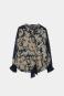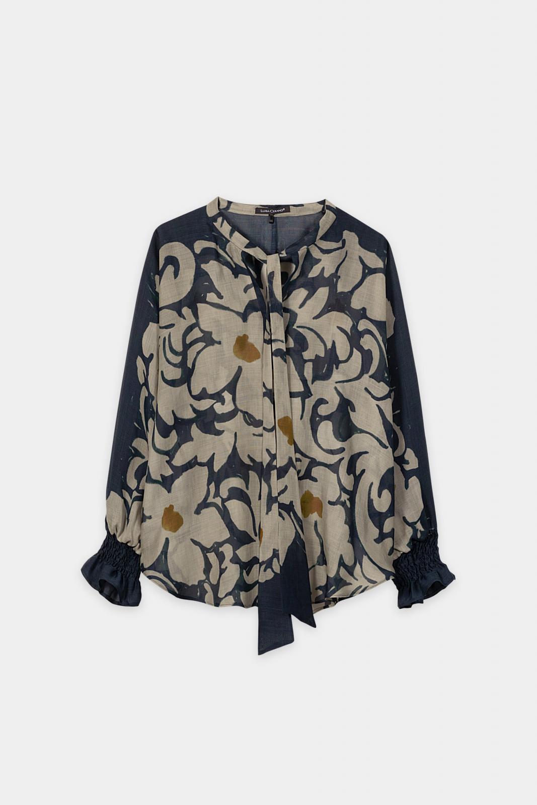 Semitransparente Bluse aus Lyocell-Ramie-Mischung mit exklusivem, ornamentalem Blumendessin. Die Bluse mit extravaganter Cape-Silhouette hat einen offenen Ausschnitt mit Schluppe und gesmokte Ärmelabschlüsse.