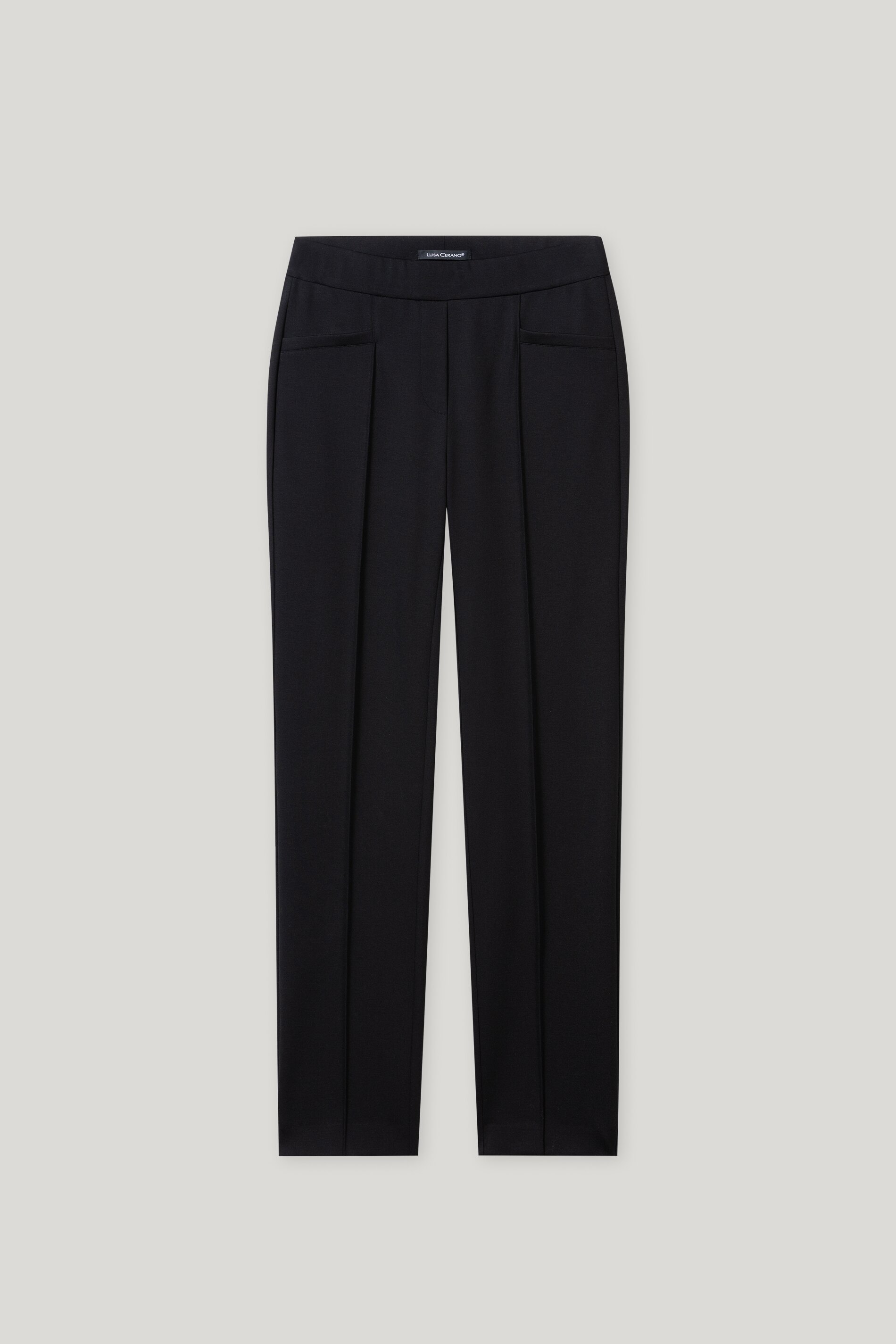Schmal geschnittene Joggpants in elegantem Design mit leicht verkürztem Schnitt. Die Hose wurde aus weichem Punto-Milano gefertigt und verfügt über einen komfortablen Elastikbund, Biesen auf der Vorderseite sowie jeweils zwei angedeutete Taschen auf Vorder- und Rückseite.