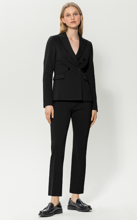 Klassisch geschnittener Blazer mit femininer Passform aus weichem Punto Milano-Stoff. Der zweireihige Blazer besitzt einen Reverskragen und angedeutete Pattentaschen.