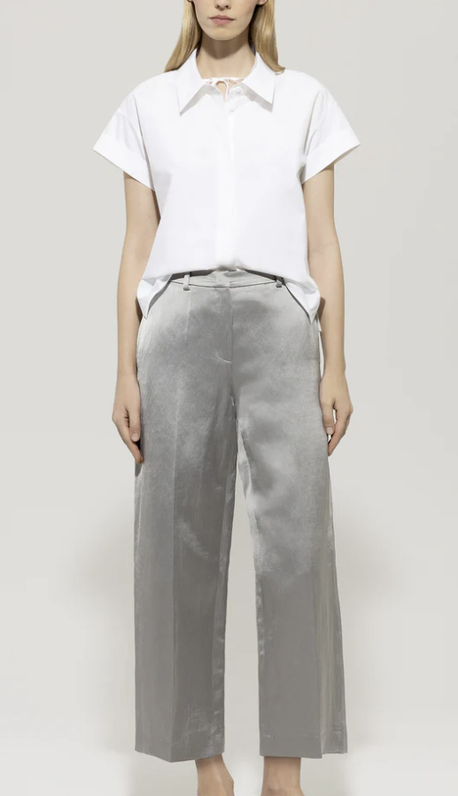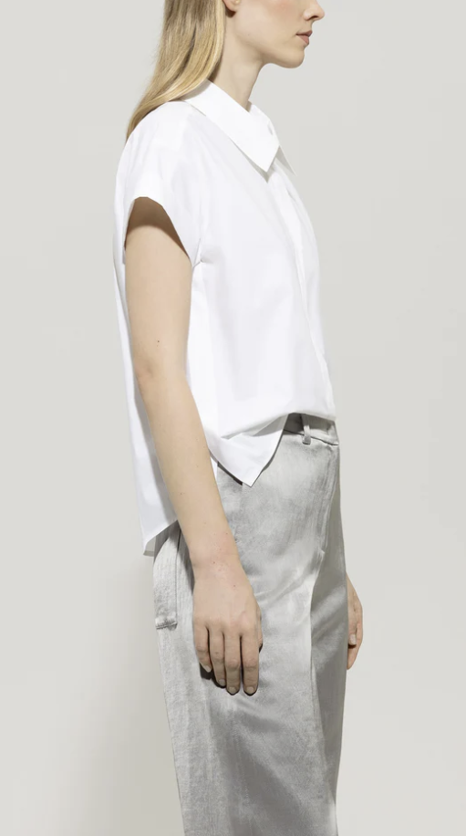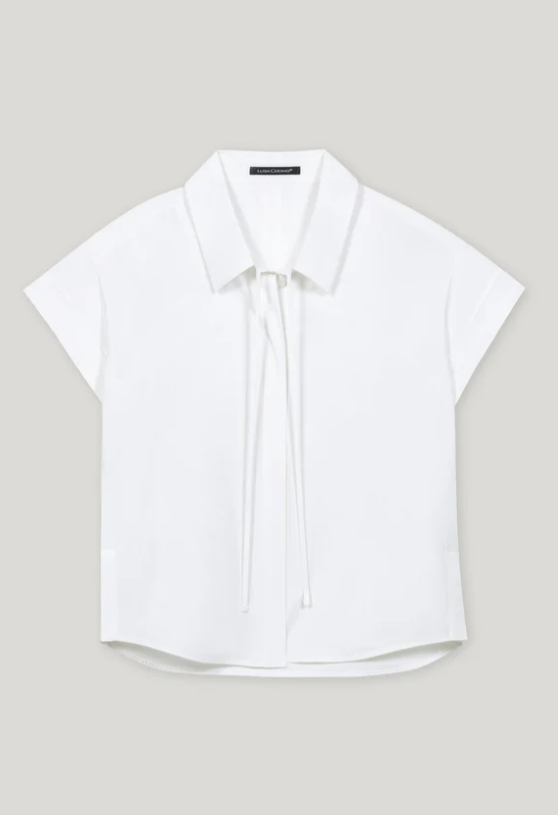 Sportive Hemdbluse aus reiner Baumwolle mit verdeckter Knopfleiste, Seitenschlitzen und feinem Bindeband am Kragen. Die kurzen Ärmel haben eine umgeschlagene Kante.
