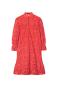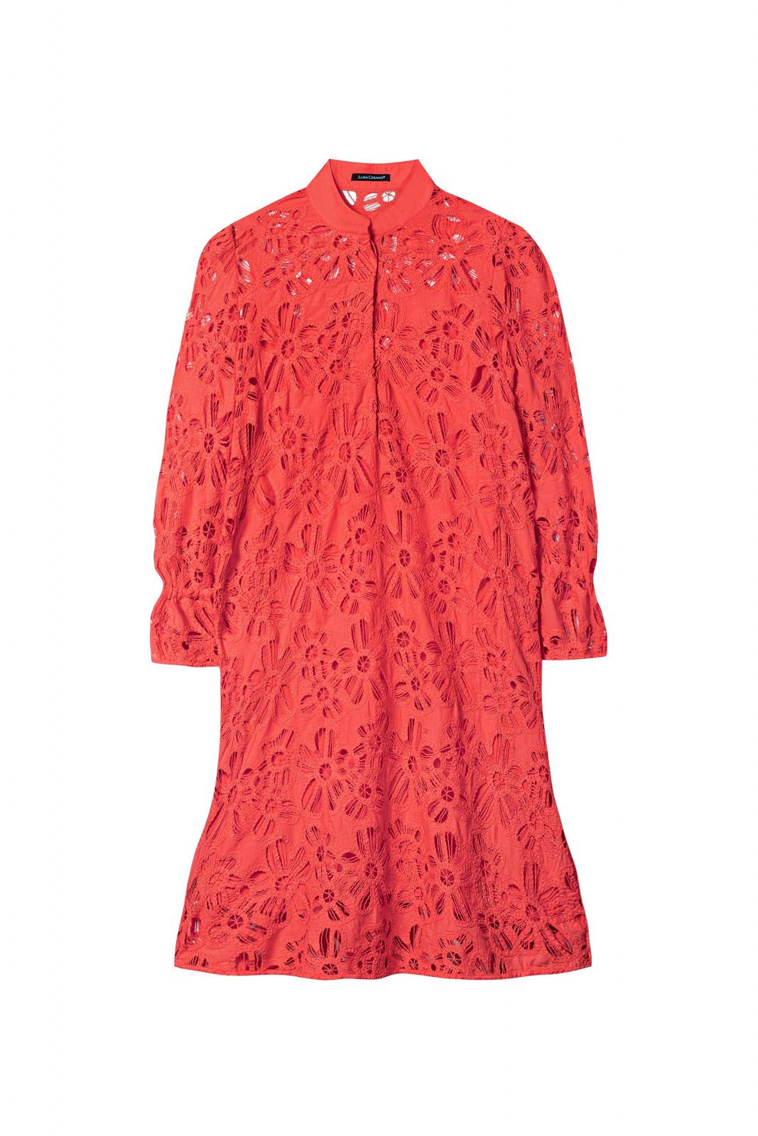 Hemdblusenkleid mit aufwendig gearbeiteter Crochetspitze aus sommerlicher Baumwolle mit losem Unterkleid. Das Design wird durch einen Stehkragen, eine verdeckte Knopfleiste, asymmetrische Saumvolants und Gummizug-Details an den Ärmeln abgerundet.