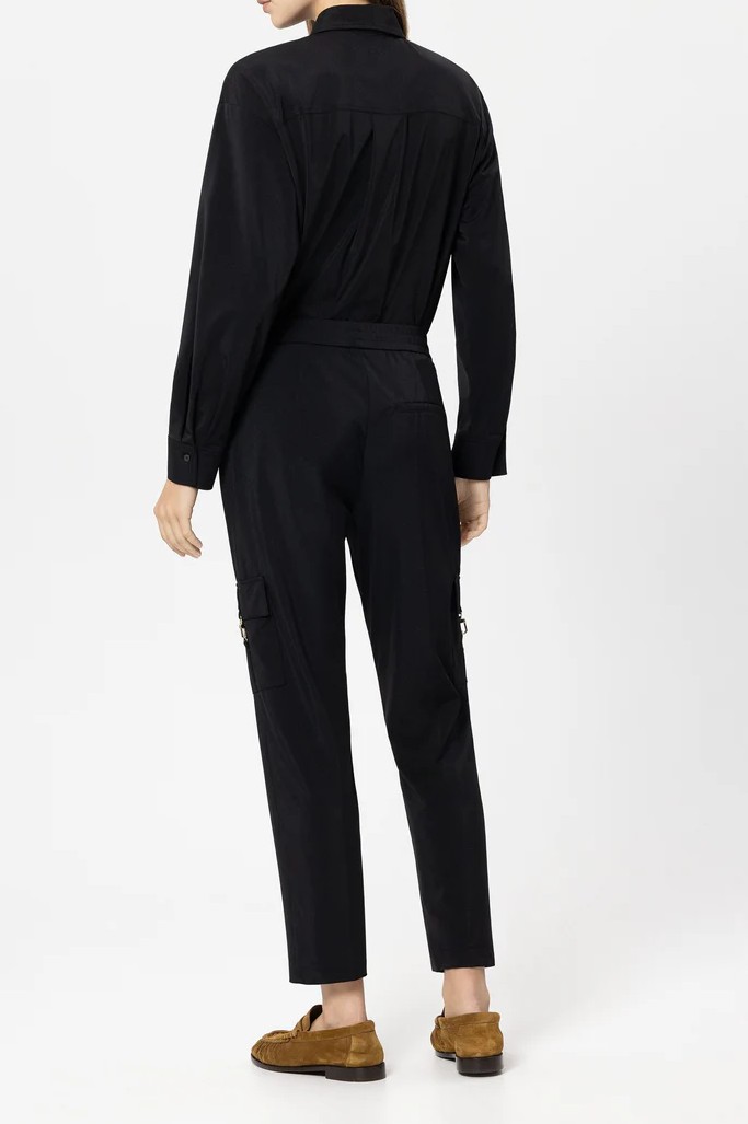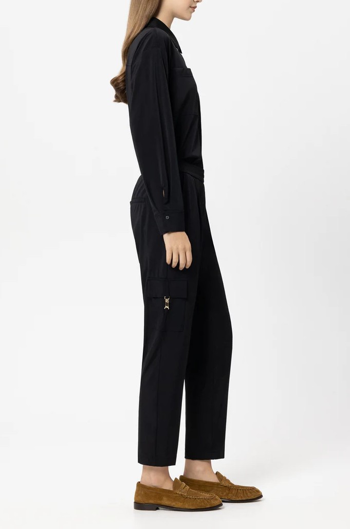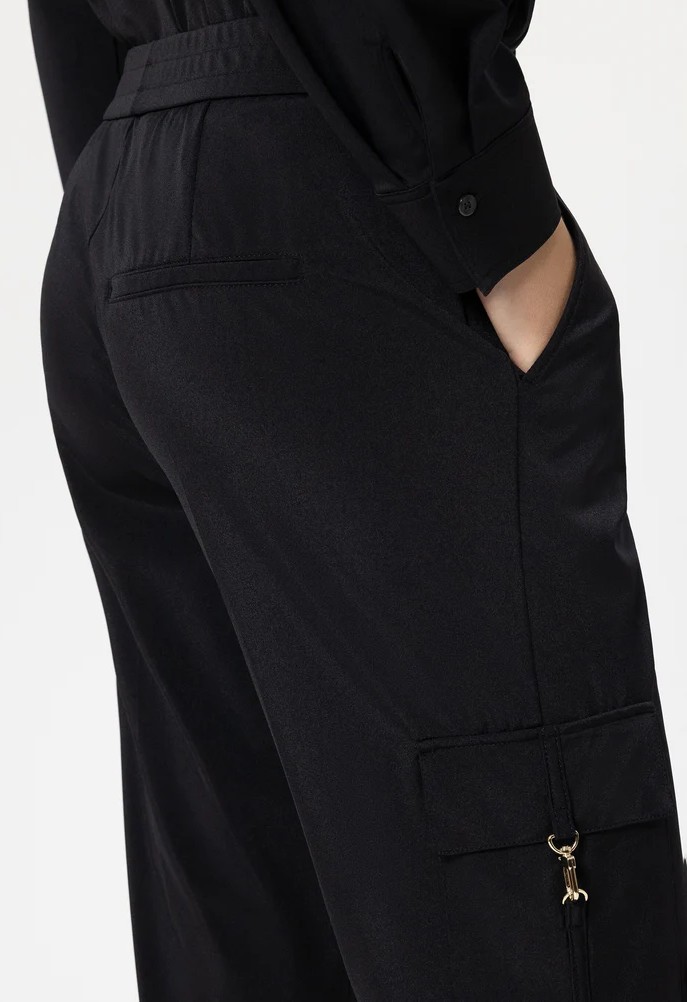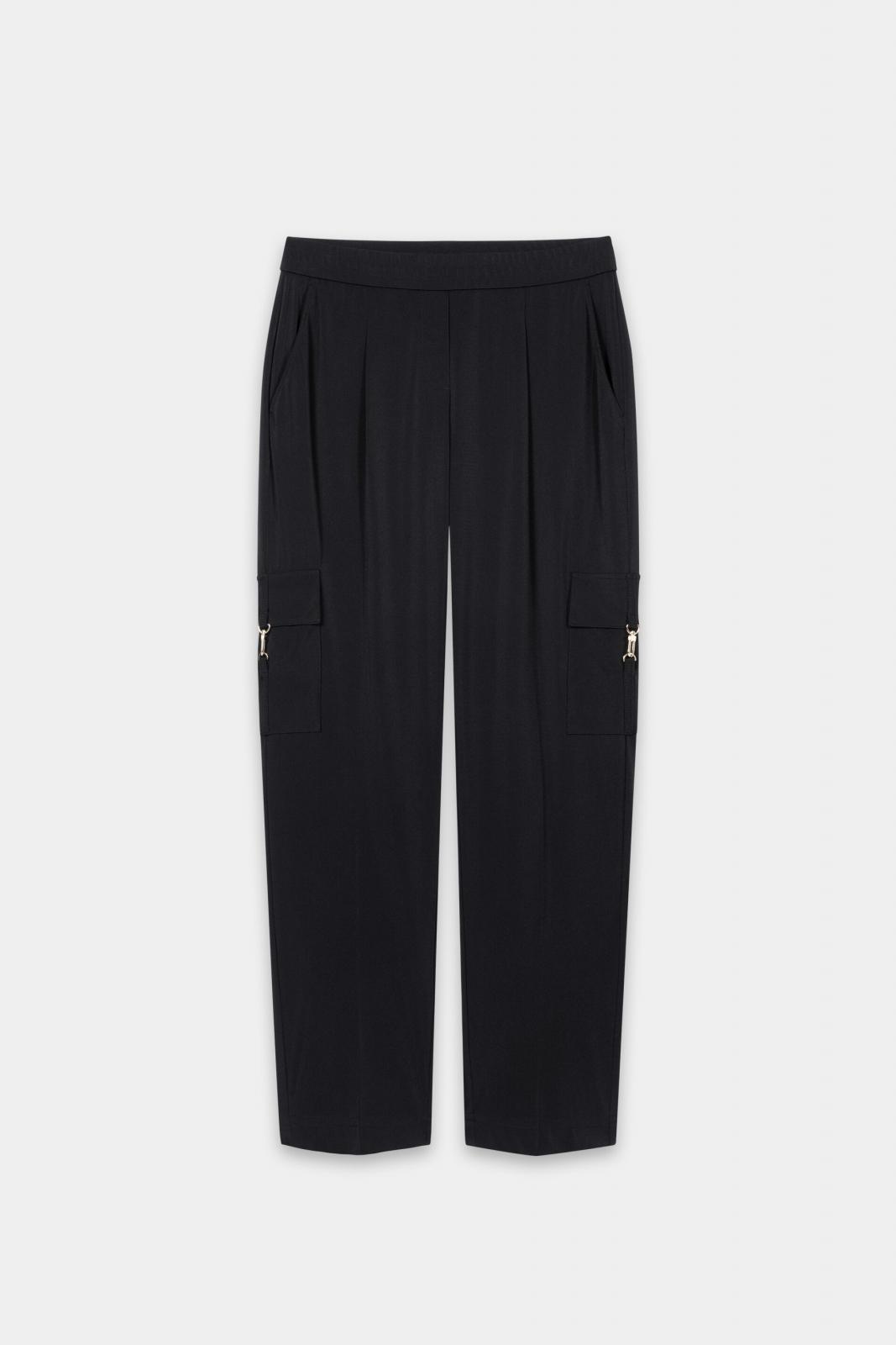Tapered-Pants aus weichem Stretch-Jersey mit elastischem Bund und Bundfalten. Blickfang sind zwei am Bein aufgesetzte Pattentaschen mit edlem Karabinerhaken aus hochglänzendem Metall.