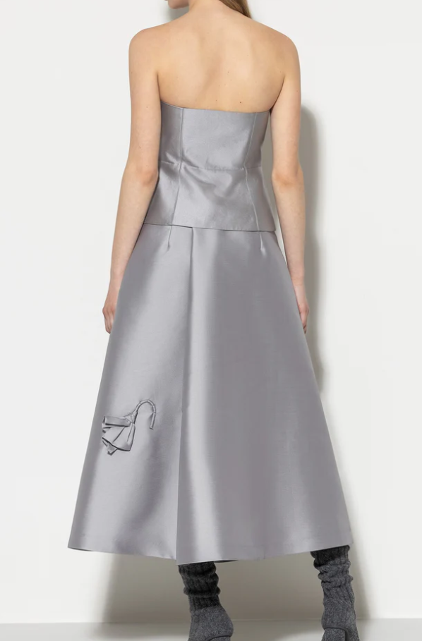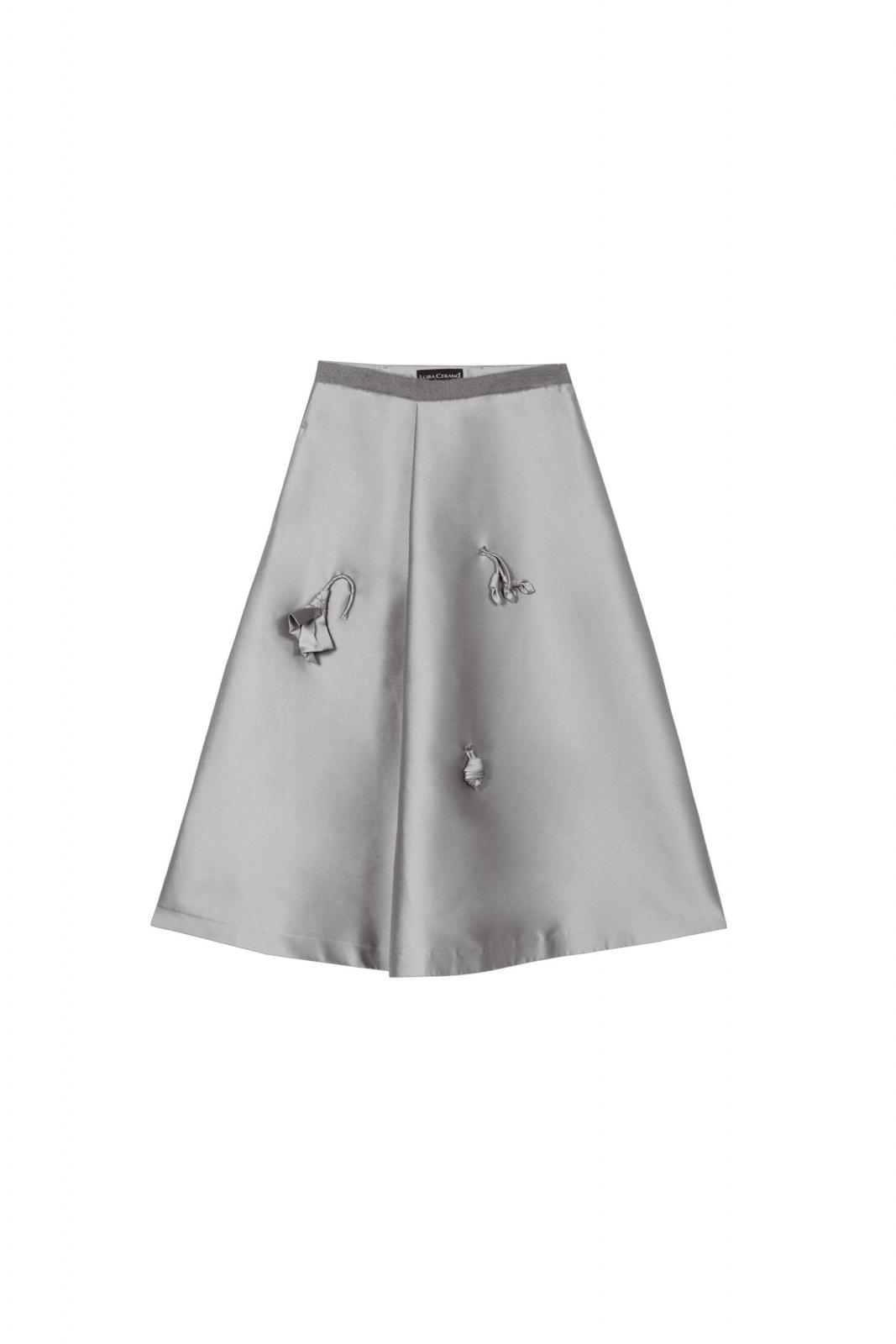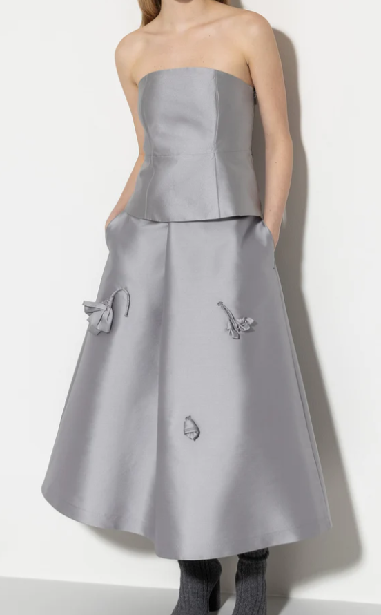 Langer, extravaganter Rock aus matt glänzendem Twill-Seiden-Mix in betonter A-Silhouette mit asymmetrischen Faltendetails. Der gefütterte Rock ist aufwendig mit handgefertigten, dreidimensionalen Blüten besetzt. Am Bund besticht das Design durch ein weiches Mohair-Band.