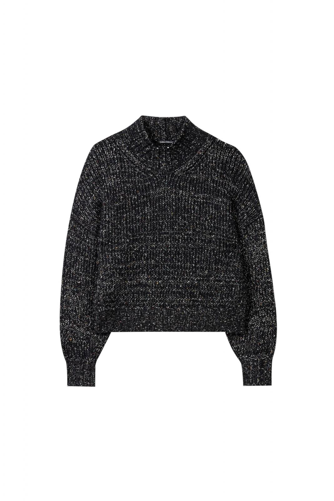 Turtleneck-Pullover aus weichem, italienischem Fancy-Tweed-Garn mit dezenten Farbakzenten. Der Pullover hat einen leicht verkürzten Schnitt und lässig überschnittene Schultern.