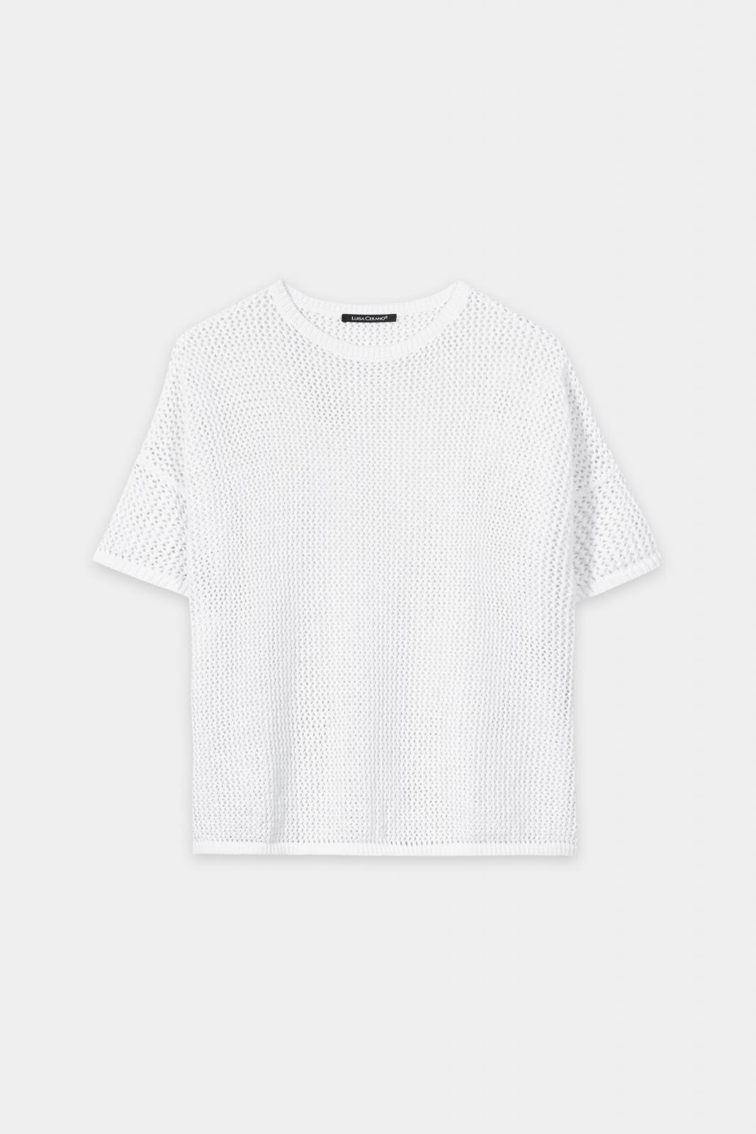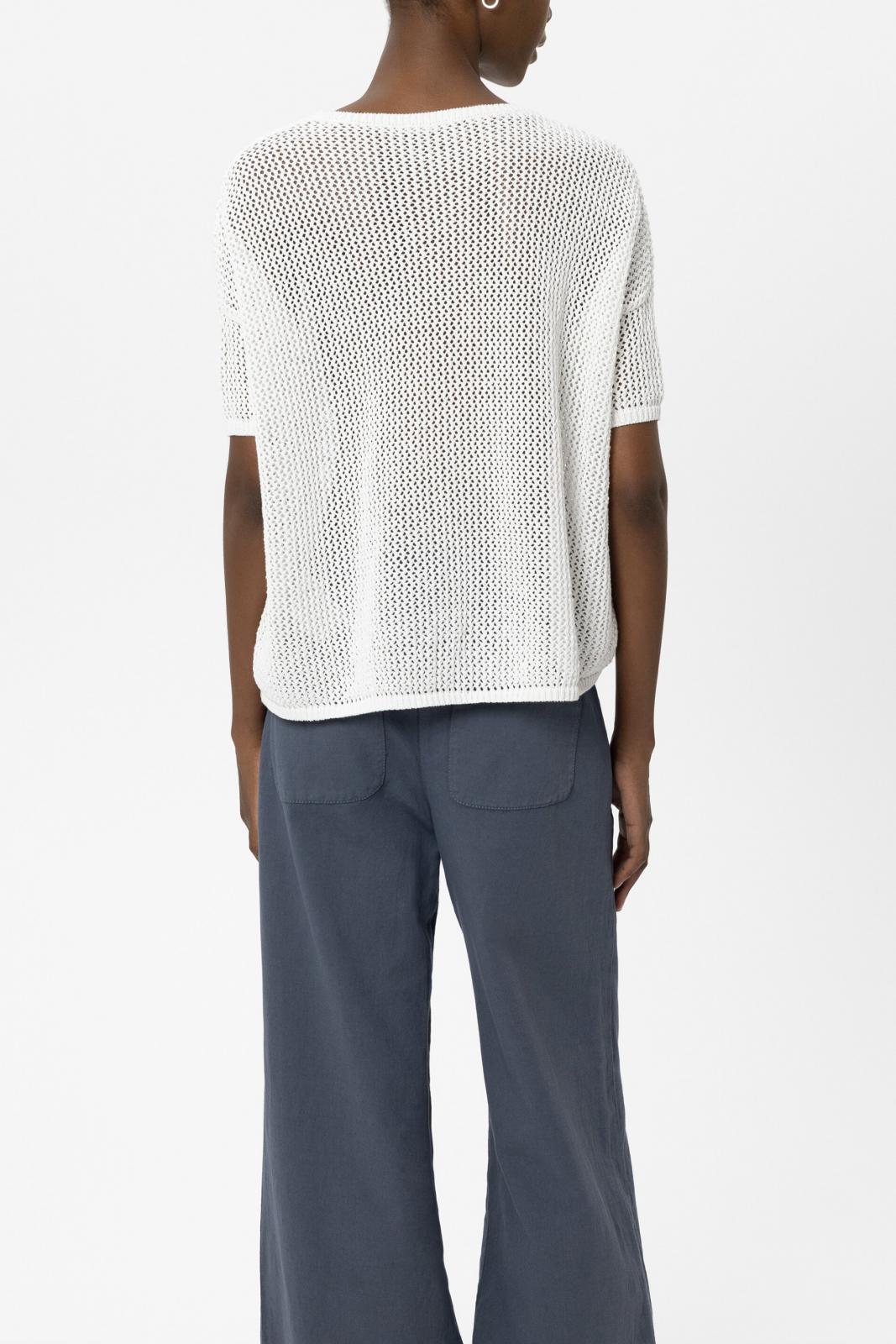 Locker geschnittener Kurzarm-Pullover aus sommerlichem Tape-Garn in Netzoptik. Rundhalsausschnitt, überschnittene Schultern und gerippte Abschlüsse komplettieren das lässige Design.