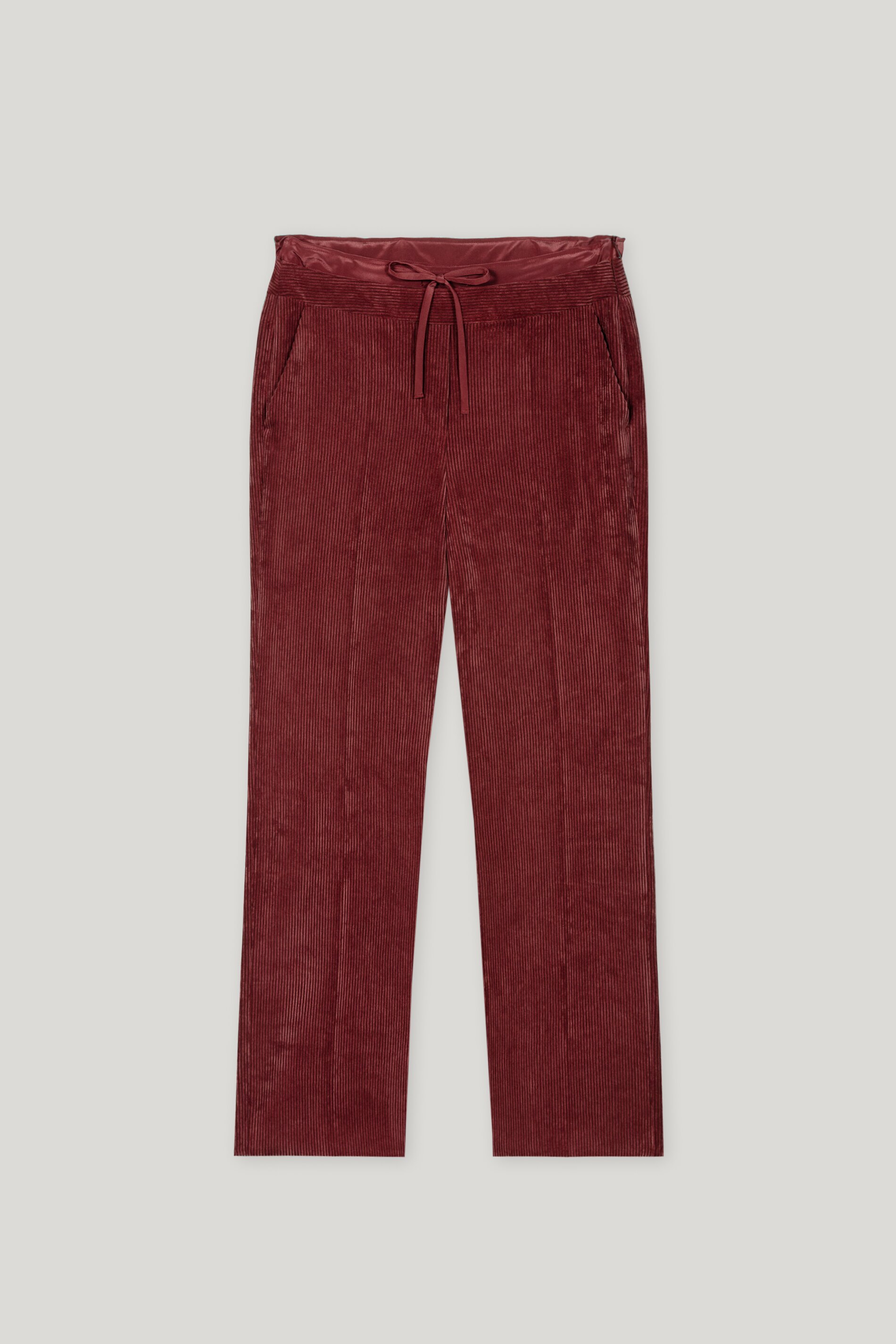 Verkürzte Joggpants aus soft fließendem Cord mit weitem Bein. Die Variante mit dem Doppelbund hat einen Kordelzug zur individuellen Weitenregulierung.