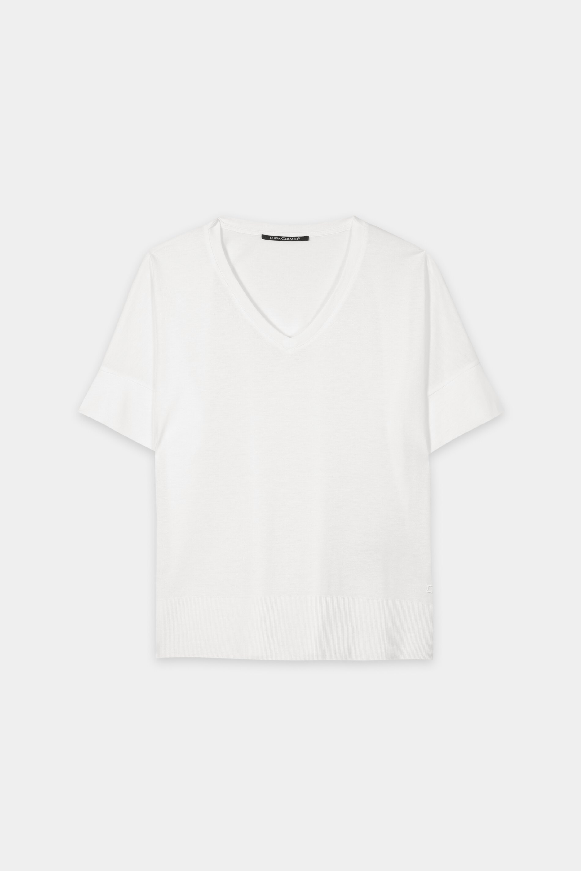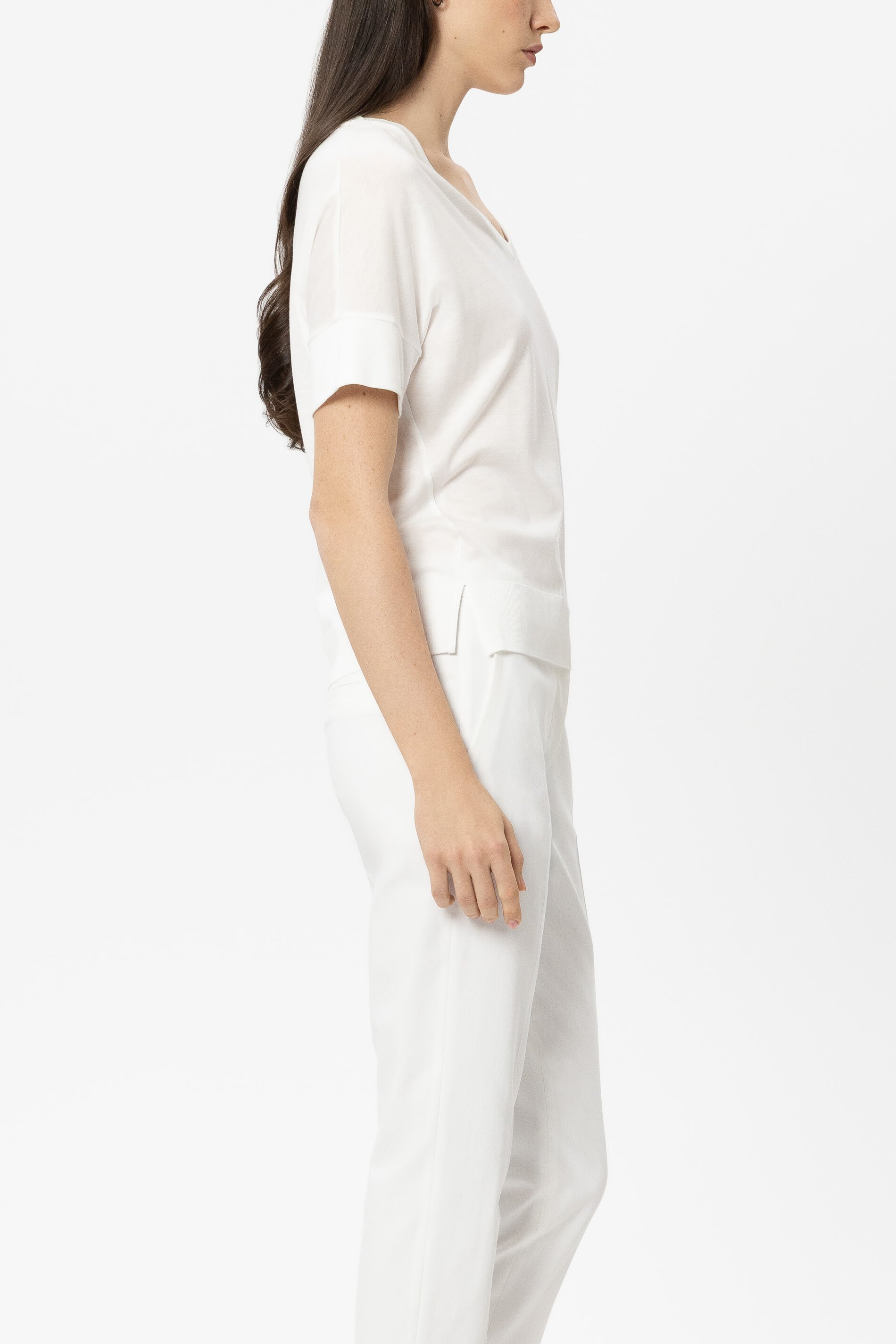 T-Shirt aus hochwertiger Baumwoll-Mischung mit V-Ausschnitt und überschnittener Schulter. Der Saum zeigt eine gerippte Kante und ist seitlich geschlitzt.