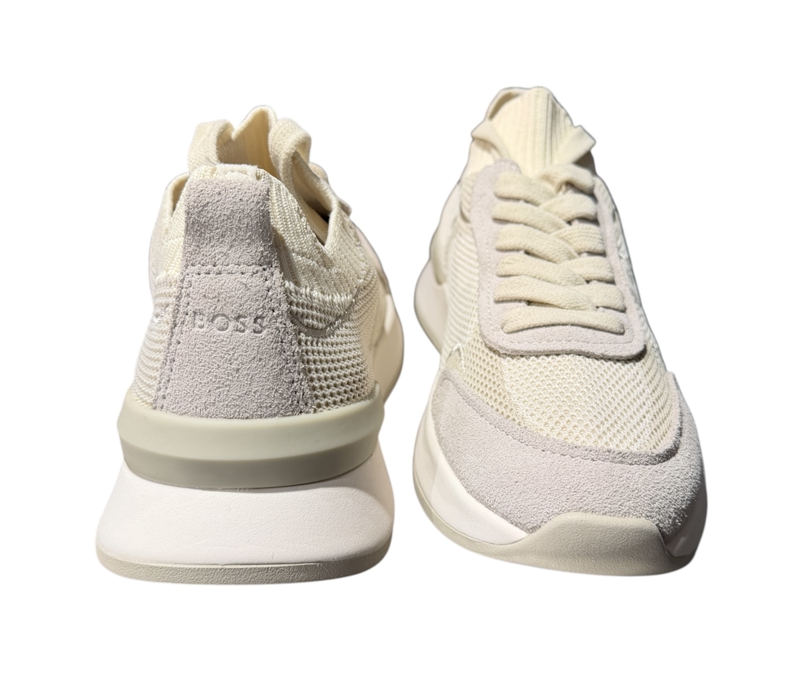 Diese BOSS Sneakers kombinieren gestrickte Sock-Obermaterialien mit soften Velourslederbesätzen und haben ein Double-B-Monogramm auf der Seitenpartie. Schnürsenkel im Frottier-Look.