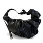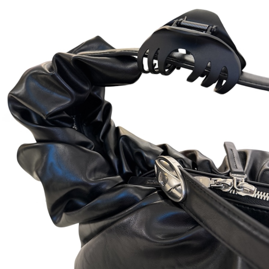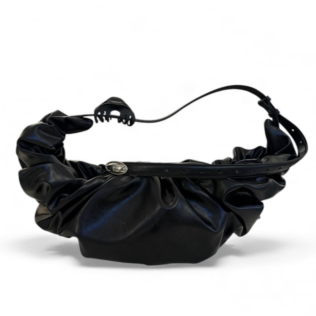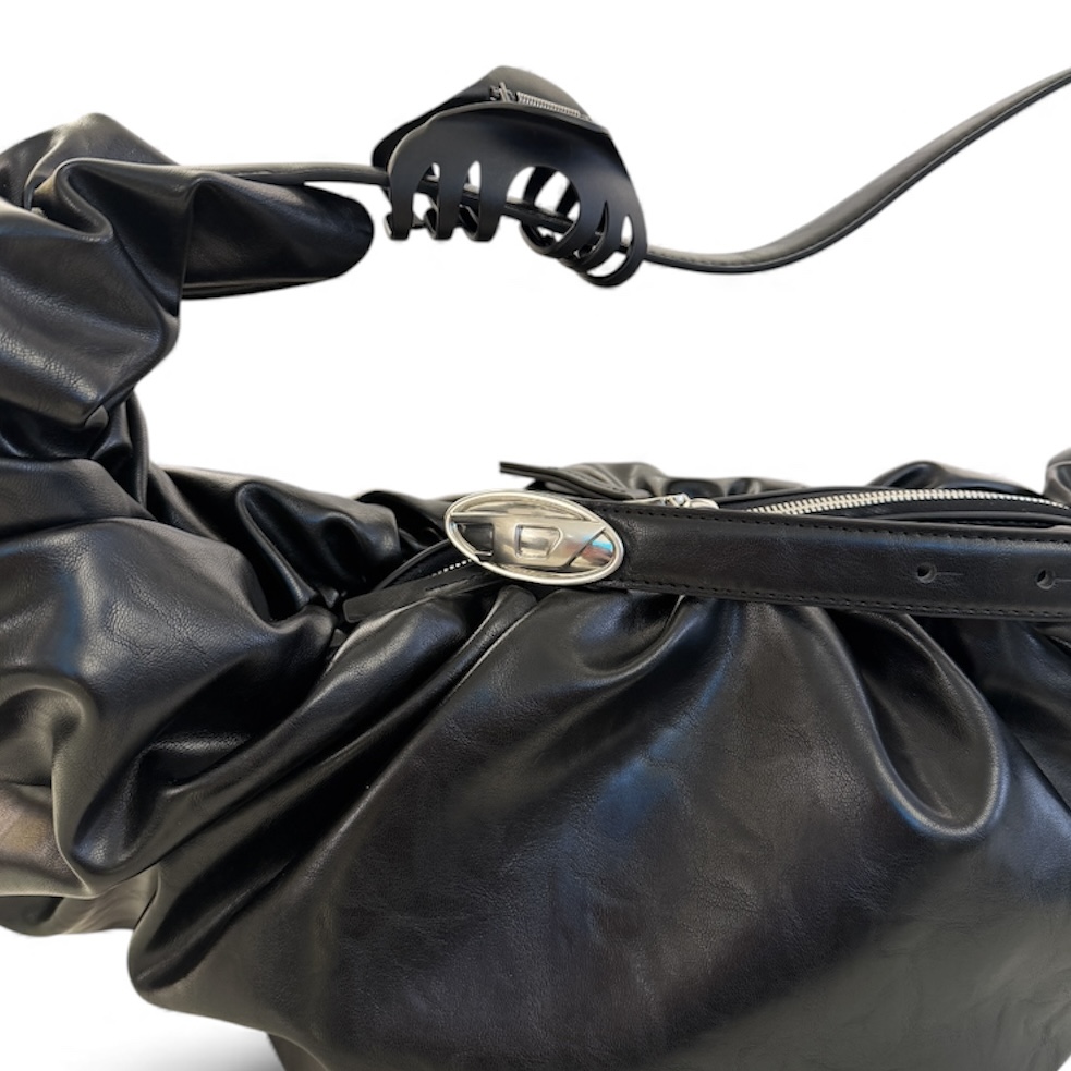 Diese große Schultertasche für Damen ist ein exklusives Accessoire der FW25 Runway Show-Kollektion. Sie hat eine lässige Hobo-Silhouette und ist entlang des Reißverschlusses gerafft, um einen zerknitterten Effekt zu erzielen. Sie ist besonders weich und geräumig und hat eine spielerisch am Griff befestigte Haarkralle, deren innovatives Design an einen Gürtel erinnert - achten Sie auf das mattschwarze Oval D-Logo aus Harz, das die Spitze des baumelnden Riemens ziert. Der Zwei-Wege-Reißverschluss erlaubt einen mühelosen Zugang zum Innenraum.