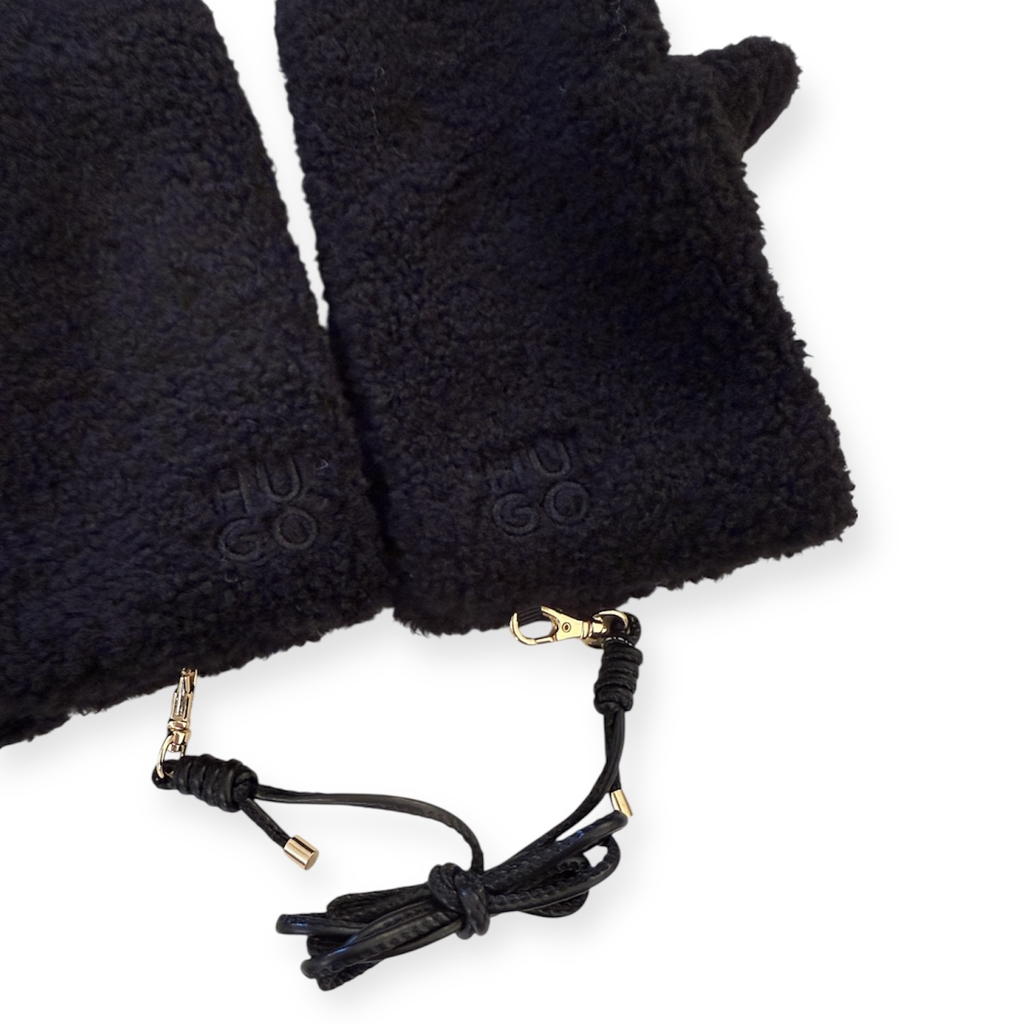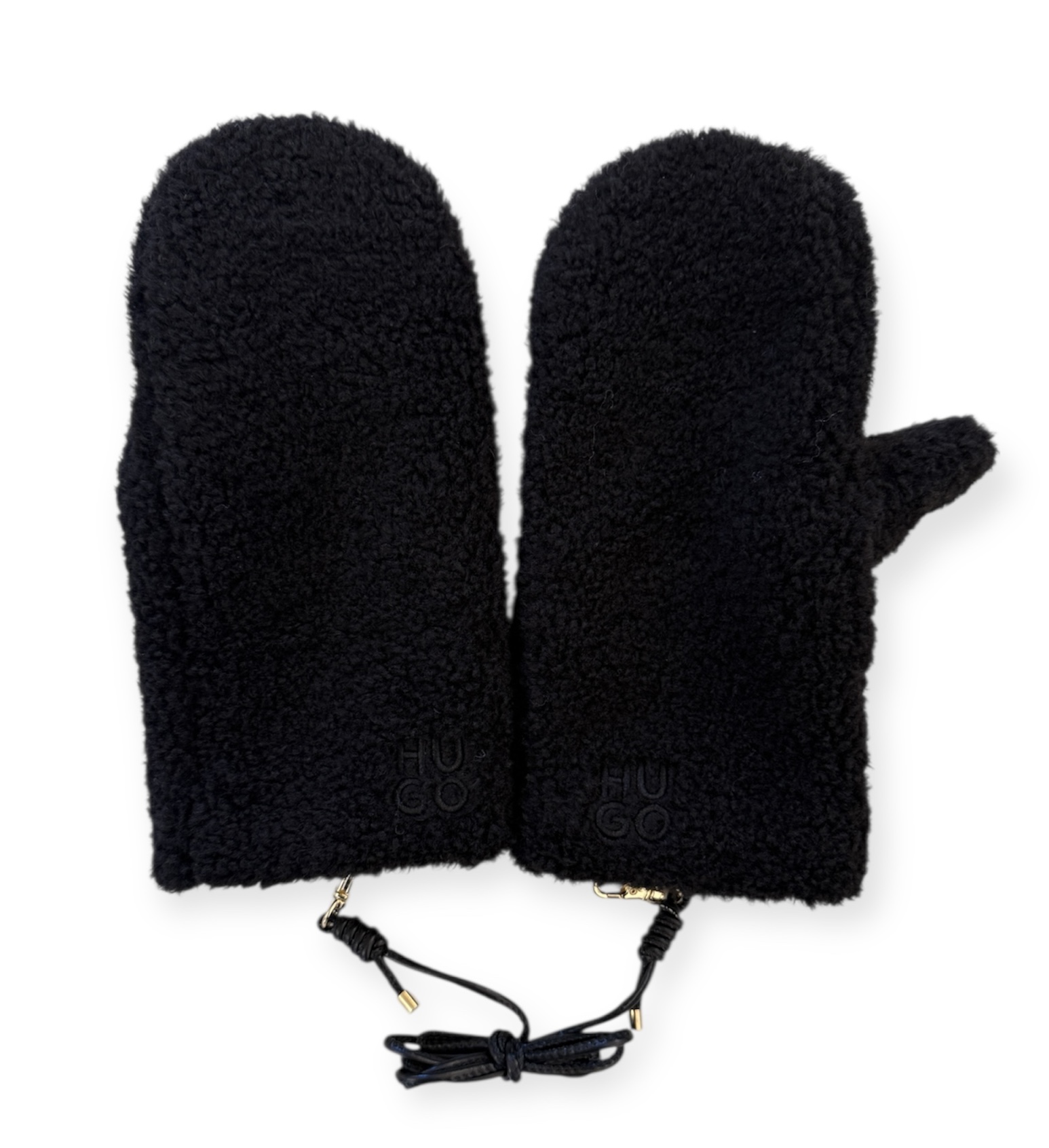 Die warmen HUGO Fäustlinge aus Teddy-Gewebe mit Kunstfell-Innenfutter halten dich im Winter angenehm warm. Gesticktes Stack-Logo. Kordel aus synthetisch beschichtetem Textil.