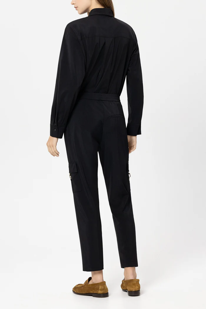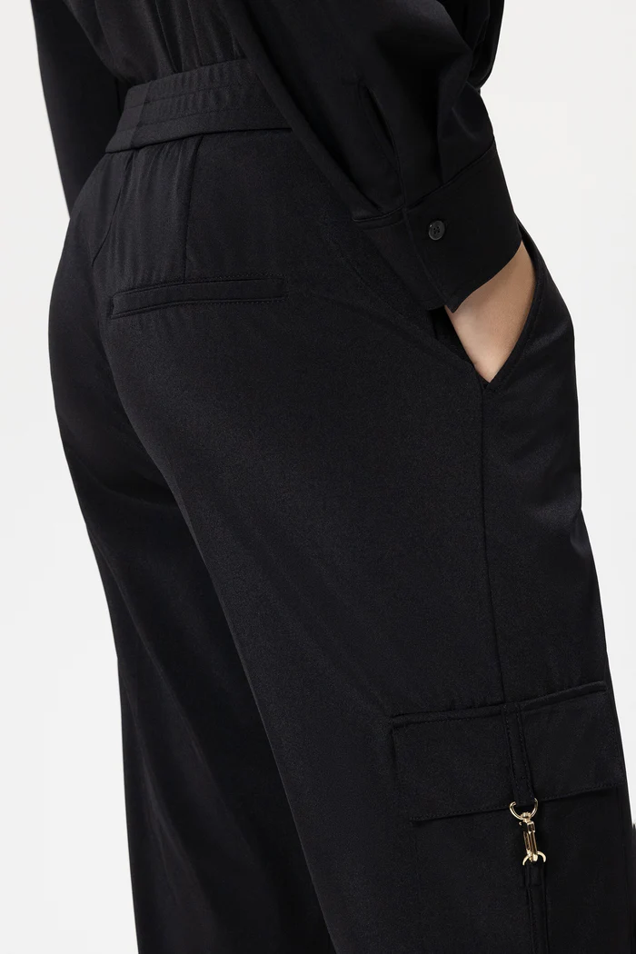 Tapered-Pants aus weichem Stretch-Jersey mit elastischem Bund und Bundfalten. Blickfang sind zwei am Bein aufgesetzte Pattentaschen mit edlem Karabinerhaken aus hochglänzendem Metall.