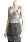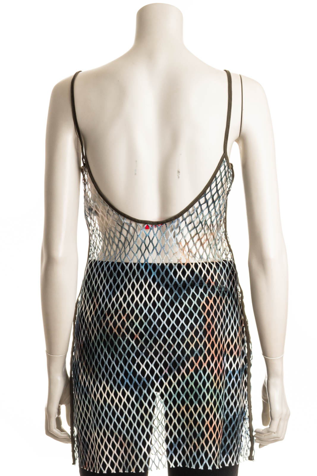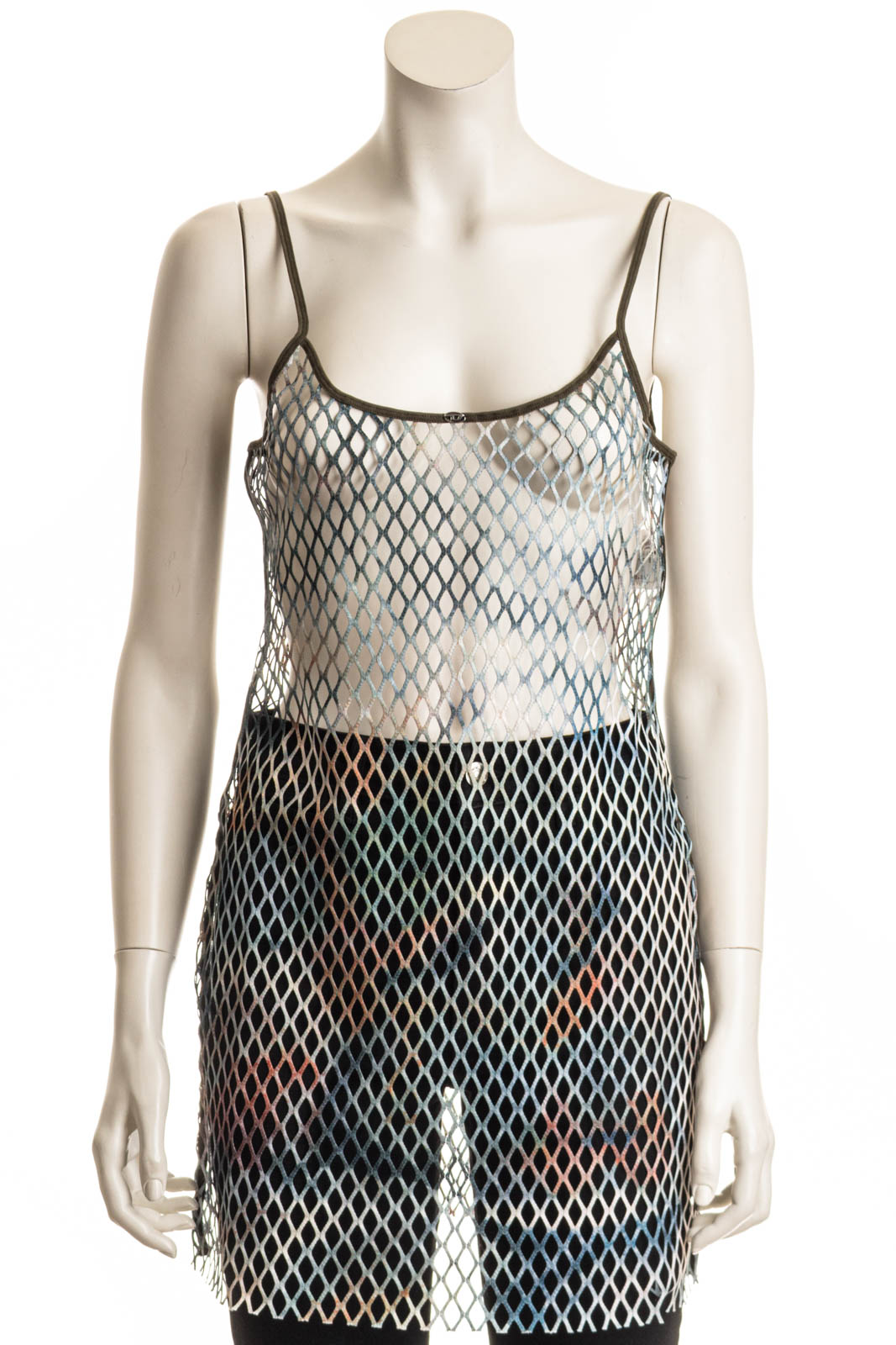 Das Kleid aus doppellagigem Mesh-Gewebe, zeichnet sich durch einen Allover-Print im Tarnmuster-Stil aus und ist an Nähten und Säumen für zusätzliche Struktur mit gerippten und Jersey-Besätzen versehen. Ein ovaler D-Anhänger aus Metall ziert den Kragen.