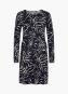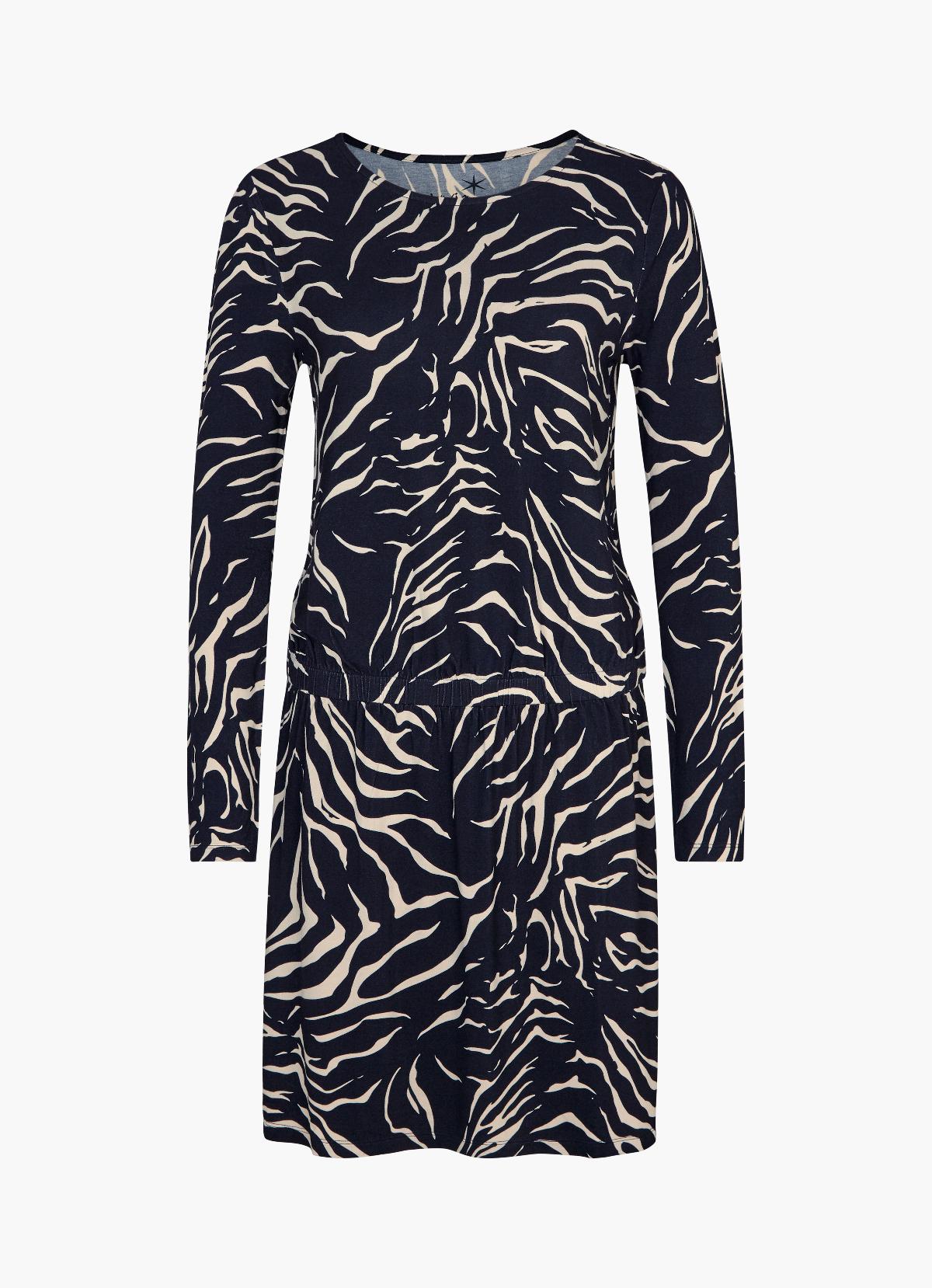 Weicher Viskose-Jersey und der „Zebra“ Allover-Print verleihen dem femininen Kleid in Dark Navy ein stilvolles Update. Der Look begeistert mit einem klassischen Rundhalsausschnitt, langen Ärmeln und einer leicht ausgestellten Silhouette. Für ein raffiniertes Finish sorgt die elastische Taillenpartie.