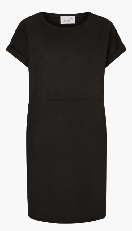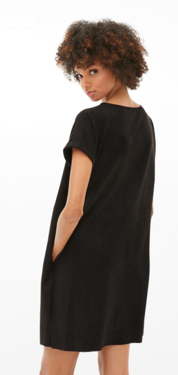 Schwarzes Kleid aus superweichem Tech-Velours, akzentuiert durch die cleane gerade Silhouette und einen femininen Rundhalsausschnitt.