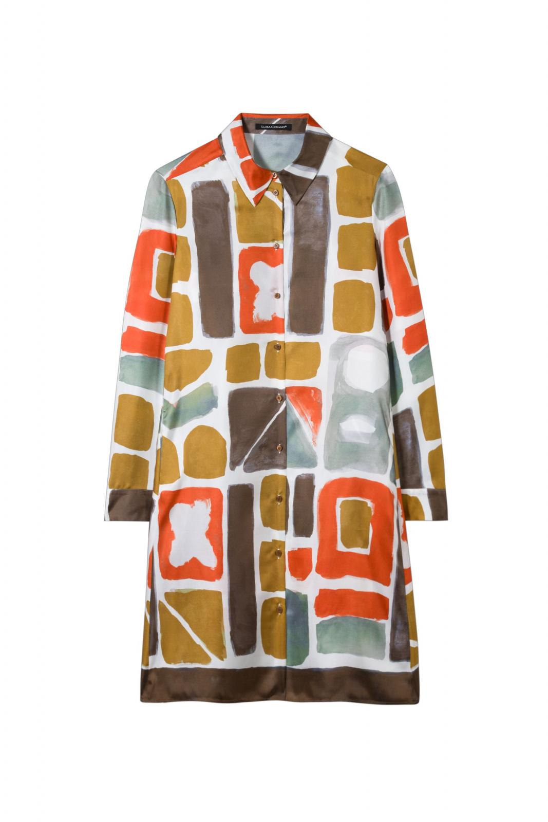 Locker fallendes, leicht ausgestelltes Hemdblusenkleid mit exklusivem Allover-Print im Ethno-Stil. Das Kleid wurde aus sommerlich leichtem Seidensatin gefertigt und ist mit edel schimmernden Knöpfen aus Perlmutt versehen.