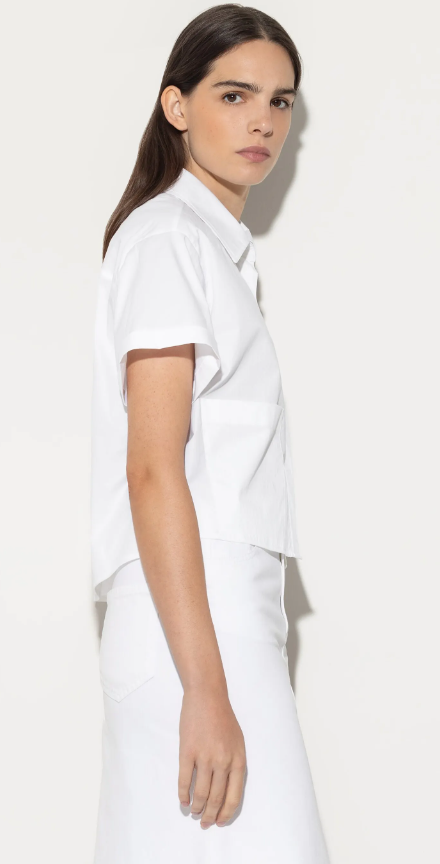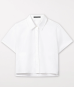 Kurze, kastenförmig geschnittene Bluse aus fein gewebtem Gabardine-Stretch-Gewebe mit verdeckter Knopfleiste und zwei aufgesetzten Taschen. Die angeschnittenen Ärmel haben einen Umschlag. Der Saum ist seitlich geschlitzt.