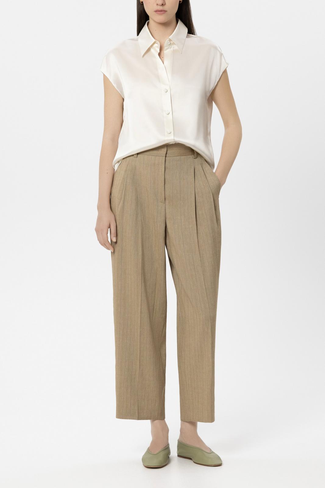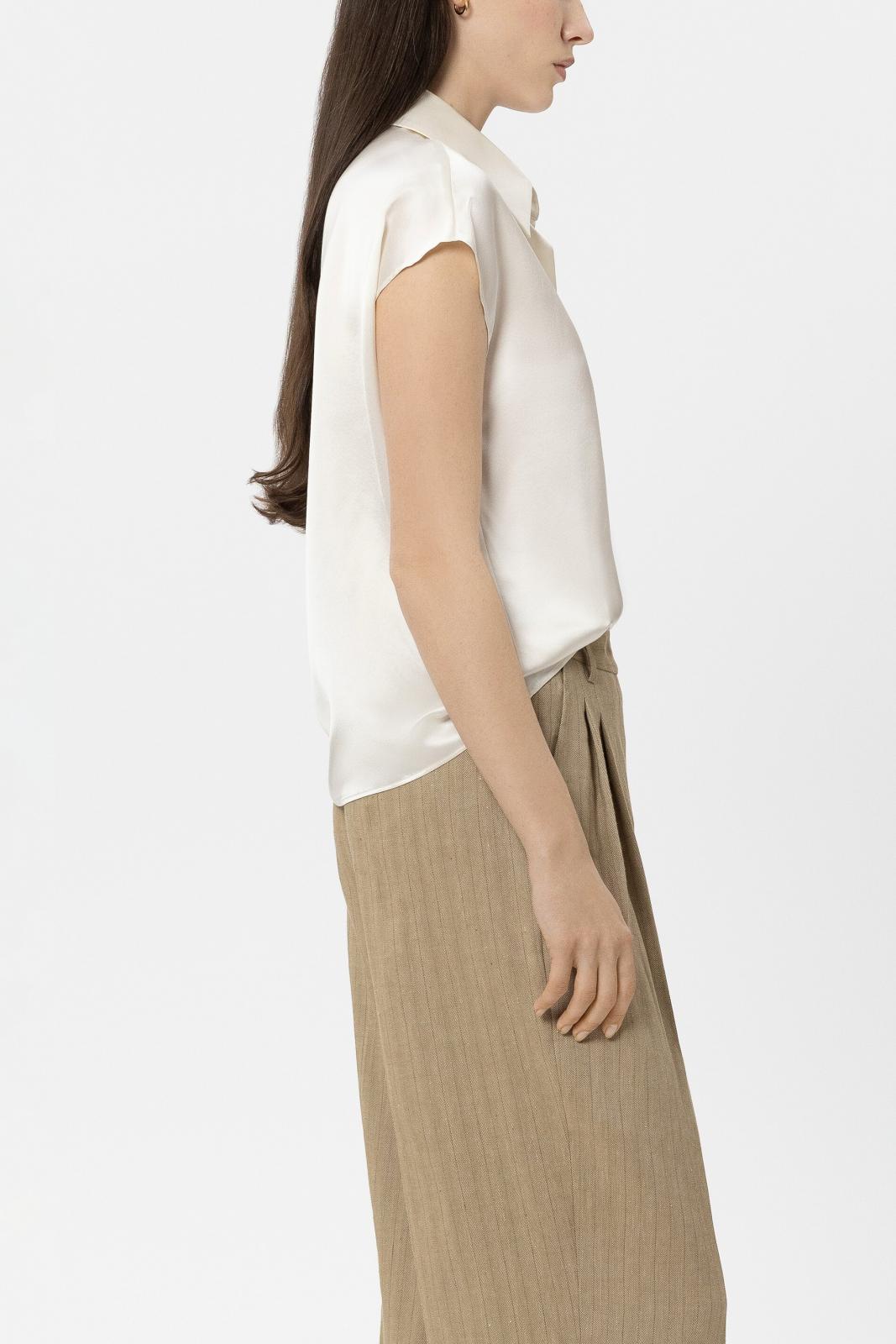 Fließend fallendes Top aus glänzendem Seiden-Satin mit angekraustem Kragen. Der asymmetrische Ausschnitt besitzt auf der Innenseite einen Knopfverschluss.
