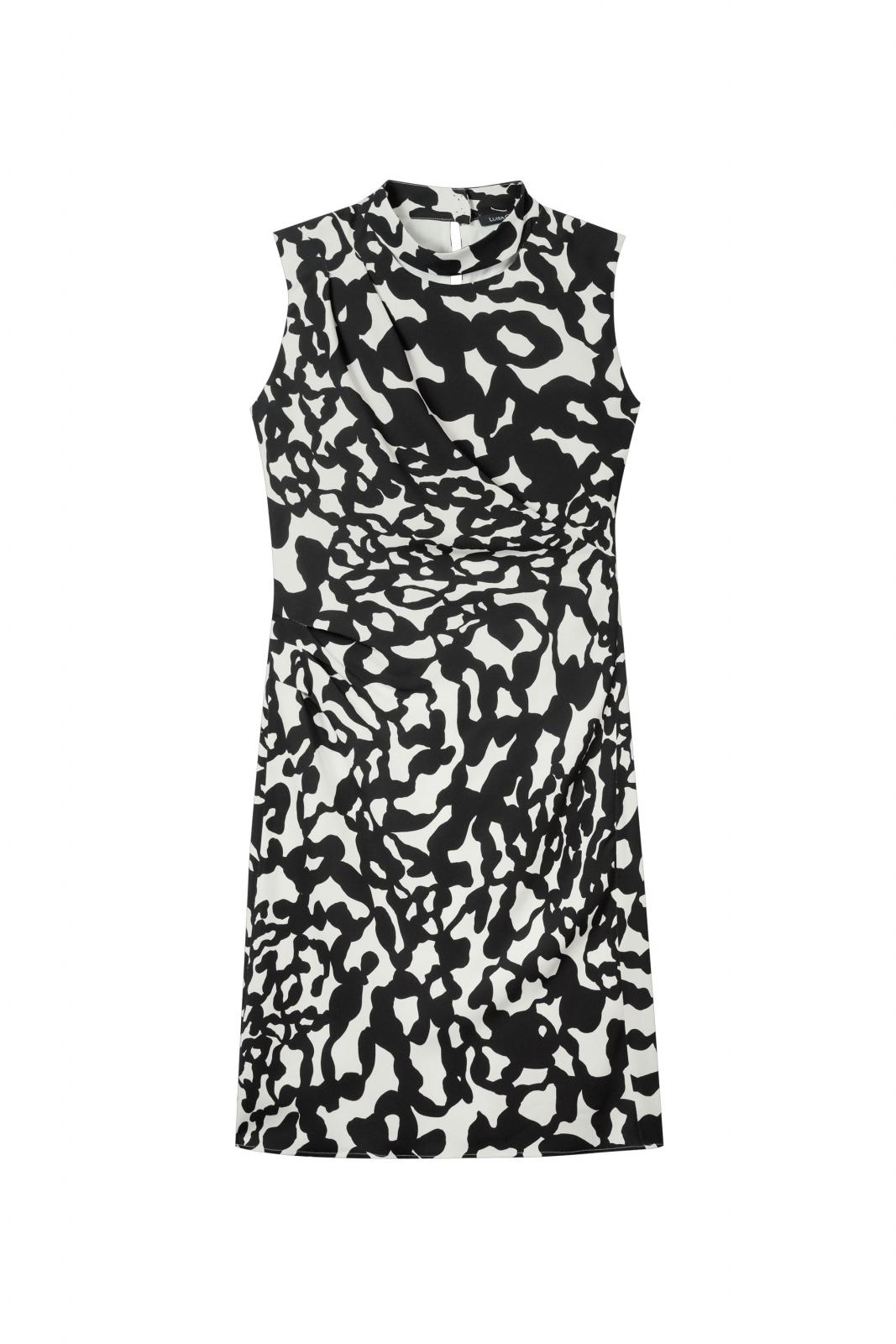 Ärmelloses Minikleid aus blickdichtem Viskose-Crêpe mit abstrahiertem Animal-Print und gerafften Details. Der schmale Stehkragen ist mit einem eleganten Cut-out versehen.