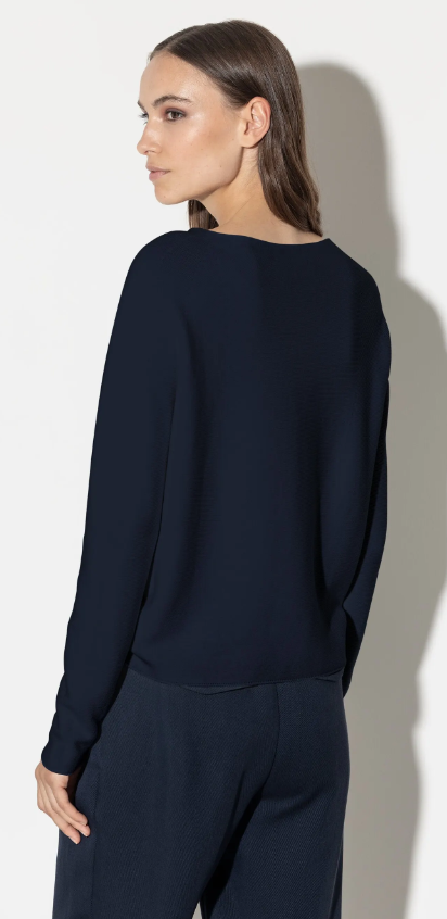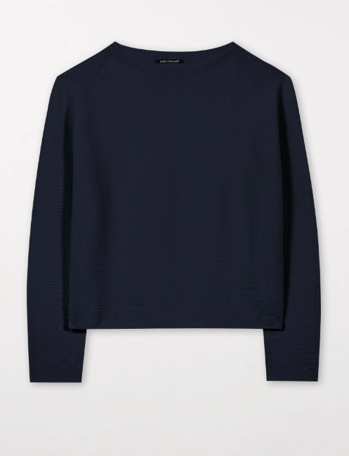 Dünner Pullover aus sommerlichem Baumwollgarn mit weichem Griff. Der Pullover hat eine verkürzte Passform und besteht aus einer nahtlosen, glatten Links-Struktur.